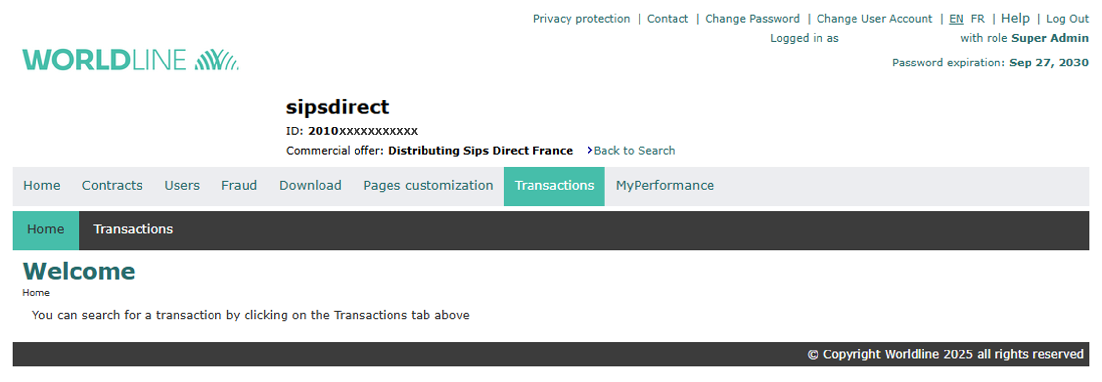 Redundant information regarding the merchant ID and the user’s role on the SOE homepage ( «Transactions » tab) has been removed if the user is on a POS*. This information remains visible if the user is on a CG**.