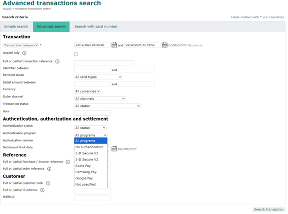 The merchant can now search for transactions by authentication program (3D, Apple Pay, Samsung Pay, Google Pay).