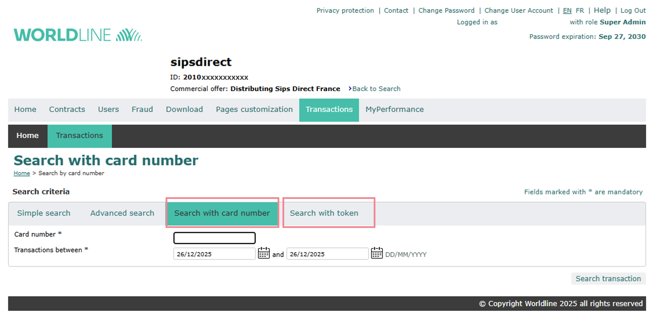 The SOE “ Search with Token “ and “ Search with card number “ rights have been uncorrelated. No changes for users already configured who retain these two rights. For new users, the “ Search with card number “ right will have to be set (previously, the “ Search with Token “ right was sufficient to access both features).