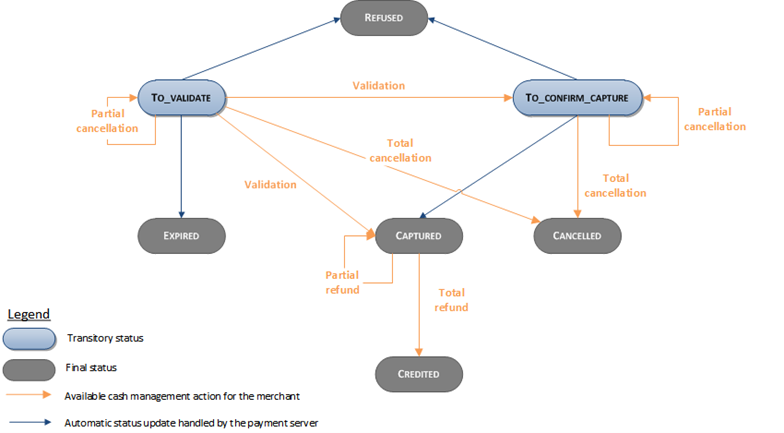 In order to comply with the specifications of the ONEY 3X 4X and PAYLATER payment methods, the transaction status diagram and the cash management operations diagram have been updated.