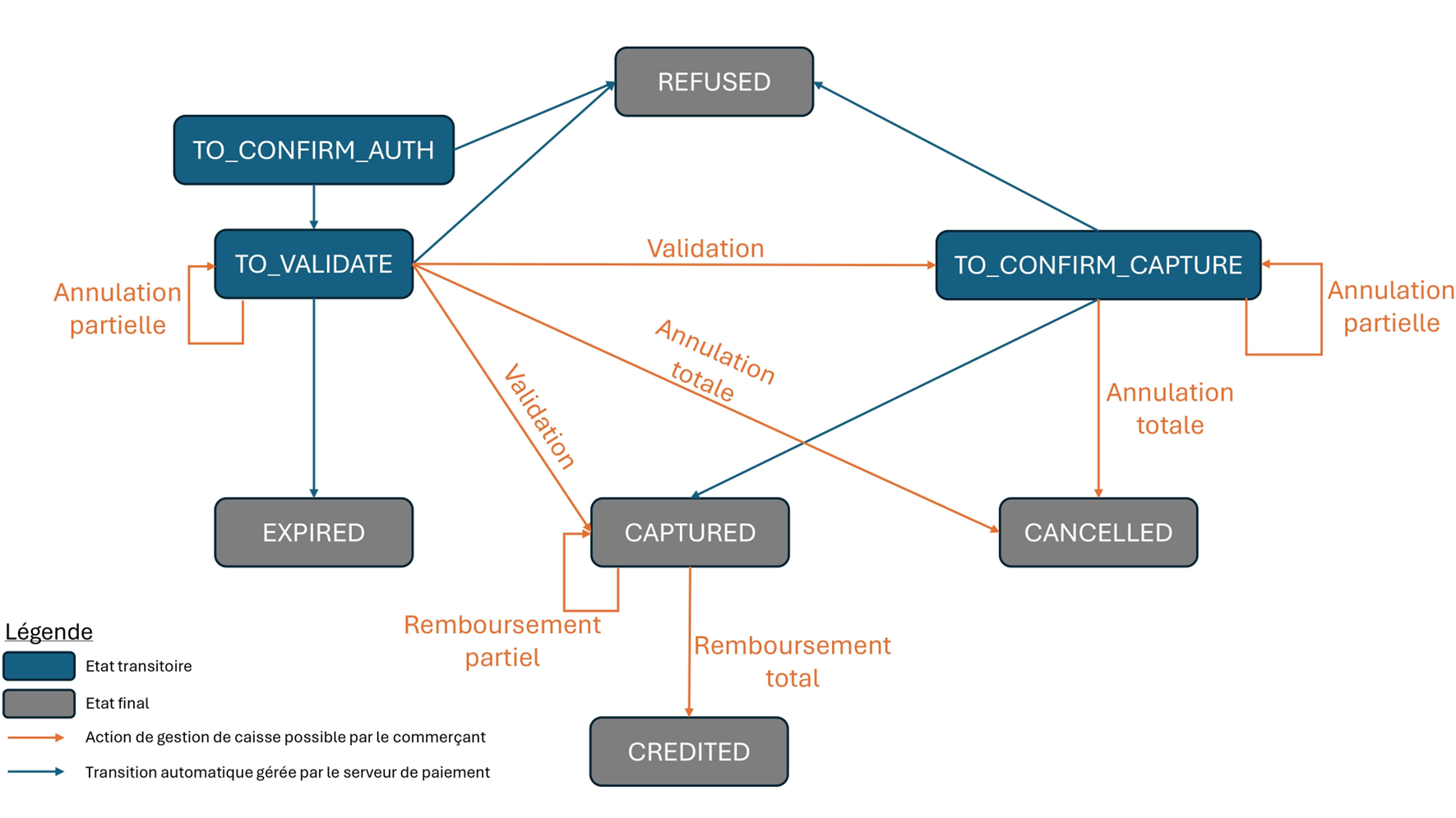 Afin d’être conforme aux spécifications du moyen de paiement ONEY 3X 4X et PAYLATER, le diagramme des états de la transaction évolue ainsi que celui des opérations de gestion de caisse.