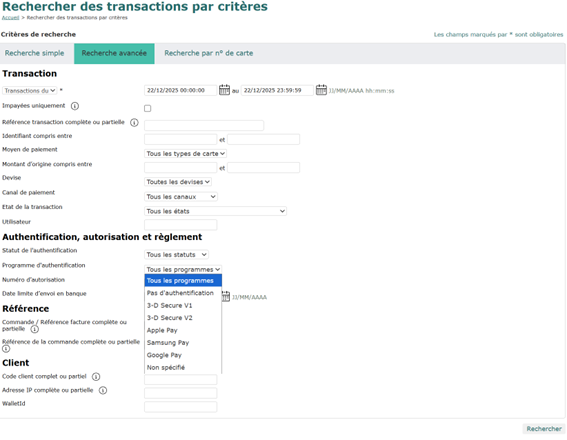 Le client peut désormais rechercher les transactions par programme d’authentification (3D, Apple Pay, Samsung Pay, Google Pay).